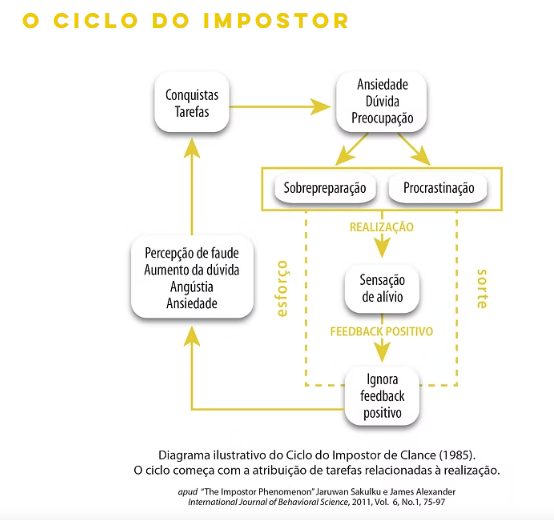 Ocasionada por diversos fatores como perfeccionismo, pressão do ambiente, baixa autoestima e tendência de autossabotagem, a síndrome do impostor é aquela impressão de insegurança e falta de autoconfiança quanto às próprias capacidades. A consciência pode ficar tão nebulosa que todas as conquistas e competências anteriores podem parecer fruto de mera sorte ou de esforços alheios, tornando o medo de falhar assustador. E assim se entra no chamado “Ciclo do impostor”, caracterizado pelas seguintes fases: